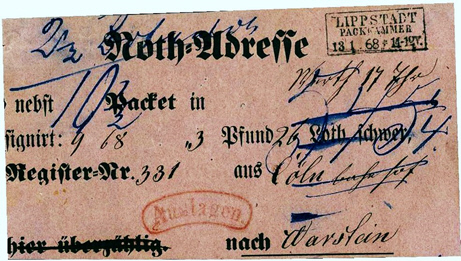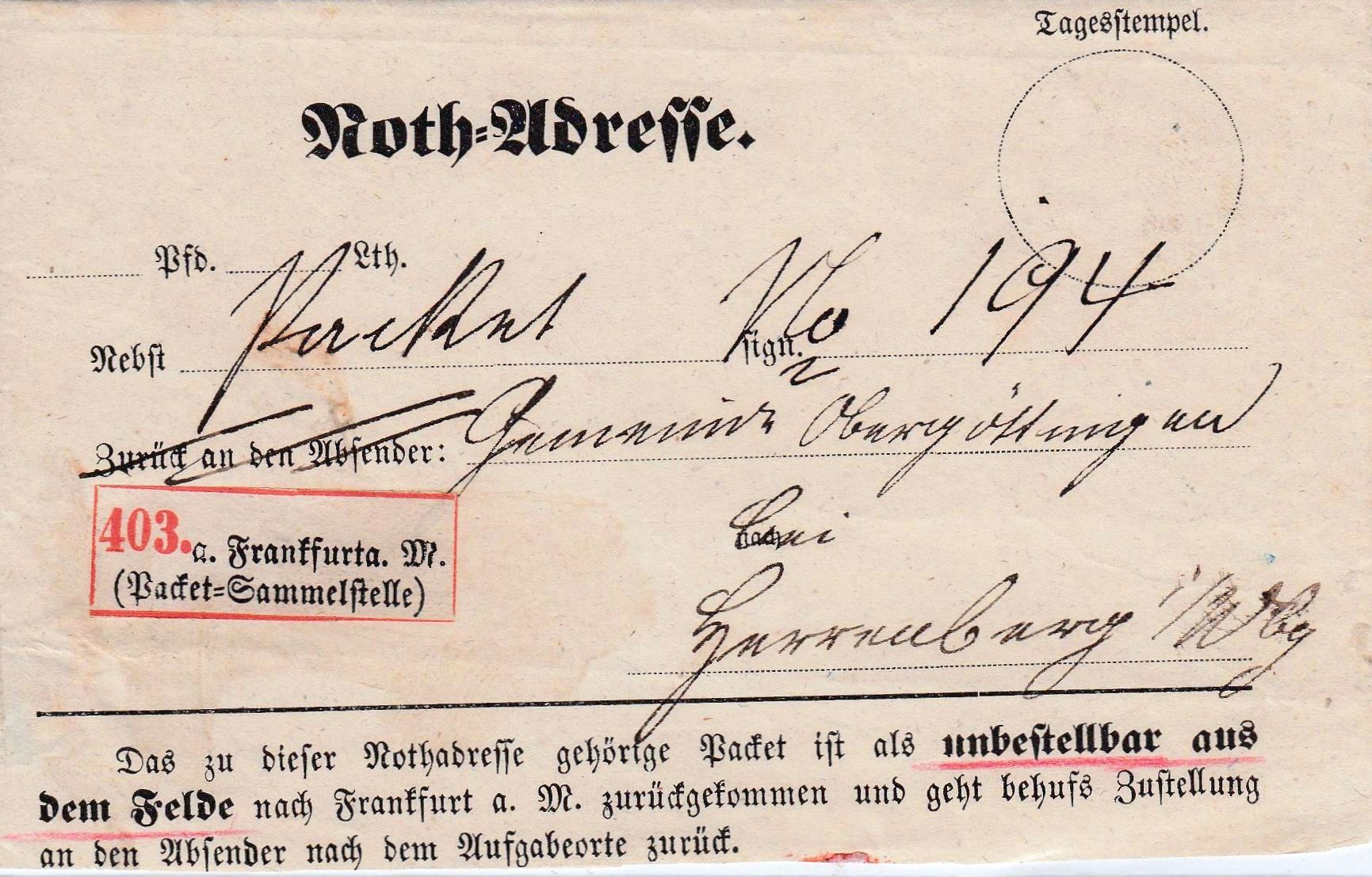 Noth-Adressen (58) Siehe auch Rundbrief 65 Seite 46. Das Procedere für unanbringliche Paketsendungen an Soldaten regelte die Feldpostordre Nr. 56 vom 9. Okt. 1870. Punkt 13 lautet: „Die von den Truppentheilen zurückgelieferten unanbringlichen Sendungen werden in die vorerwähnten vollzogenen Feldpost-Päckereikarten seitens der Truppentheile mit verzeichnet. - Das Depot bzw. Feldpostrelais hat über den Rückempfang der Feldpoststücke eine summarische Quittung zu ertheilen und die Stücke - soweit deren Zuführung an den Empfänger sich nicht etwa noch anderweitig bewerkstelligen läßt - mittels Packetsackes an das Postamt Frankfurt a.M. zu übersenden. Von dort aus sind die Feldpoststücke bei der Nach- oder Rücksendung, unter Beigabe von Nothadressen, nach den für gewöhnliche Packete ohne declarirten Wert bestehende Expeditions-Vorschriften zu behandeln, und zwar in derselben Weise, als wenn die Stücke in Frankfurt a.M. selbst zur Post aufgeliefert worden wären.“ Interessant ist, dass unbestellbare Pakete der Großherzoglich Hessischen Division (25. Div.) nicht über die Sammelstelle in Frankfurt am Main, sondern über Darmstadt liefen und dass dort die Noth-Adressen erstellt wurden. |